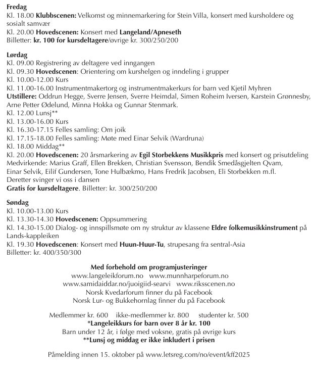 Det vil også være kurs i kveding, munnharpe, langeleik, harpe, seljefløyte, lur og bukkehorn.